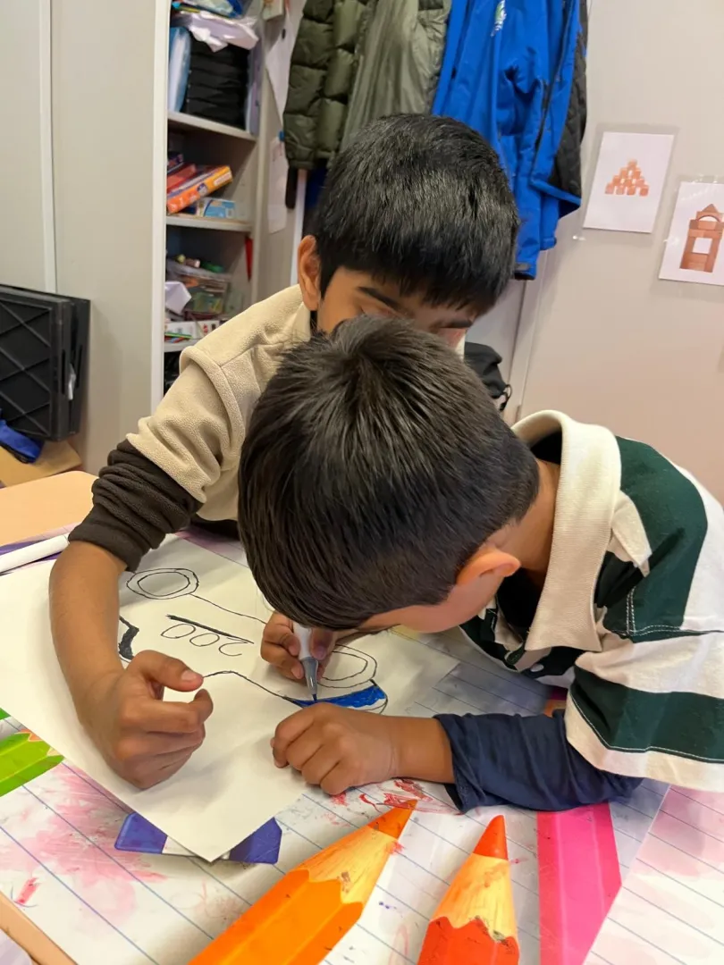 Tot slot hebben we ons creatieve brein aan het werk gezet. De kinderen gingen in tweetallen aan de slag met vingerverven en tekenen. Ze mochten zelf bedenken wat ze wilden maken, wat zorgde voor veel verschillende en originele creaties. Het samenwerken gaf mooie momenten van overleg en inspiratie, en iedereen kon trots zijn op het eindresultaat.