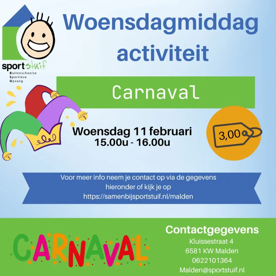 WMA Carnaval 🎉 Woensdag 11 februari is het tijd voor de woensdagmiddagactiviteit met als thema carnaval🎠🤡 We gaan allemaal leuke spelletjes doen met als klap op de vuurpijl lasergamen!🔫😃 Iedereen mag in zijn/haar leukste carnavalspak komen:) Inschrijven kan via hier!