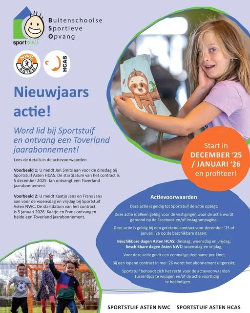 Wist je dat wij een toffe actie hebben? Start in december ’25 of januari ’26 bij Sportstuif Asten HCAS of NWC en ontvang een Toverland-jaarabonnement cadeau! Sportieve opvang na school én een jaar vol avontuur, wie wil dat nou niet?