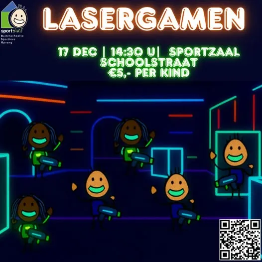 Op woensdag 17 december staat er lasergamen op het programma. De lampen gaan uit in de gymzaal, de glow-in-the-darksticks gaan aan en we bouwen een schuilplaats. Hoe leuk is het om hieraan mee te doen!