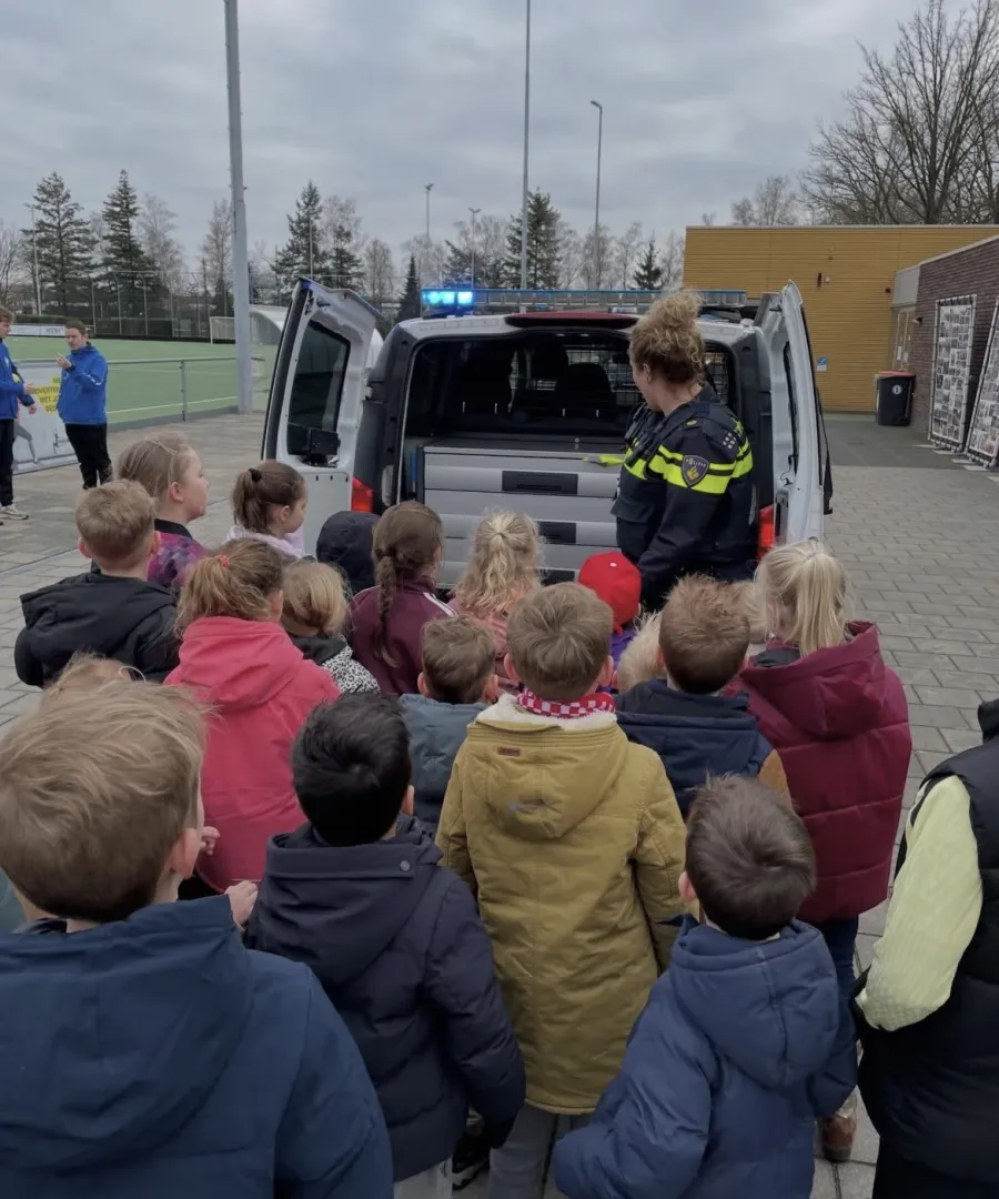 Dinsdag werd het terrein opnieuw opgeschrikt, dit keer door de politie die met loeiende sirene het terrein op kwam rijden. De kinderen keken hun ogen uit! Ook hier kregen we uitleg over het werk van de politie en mochten we een kijkje nemen in het politiebusje. Het was voor veel kinderen een bijzonder moment en er werden volop vragen gesteld.