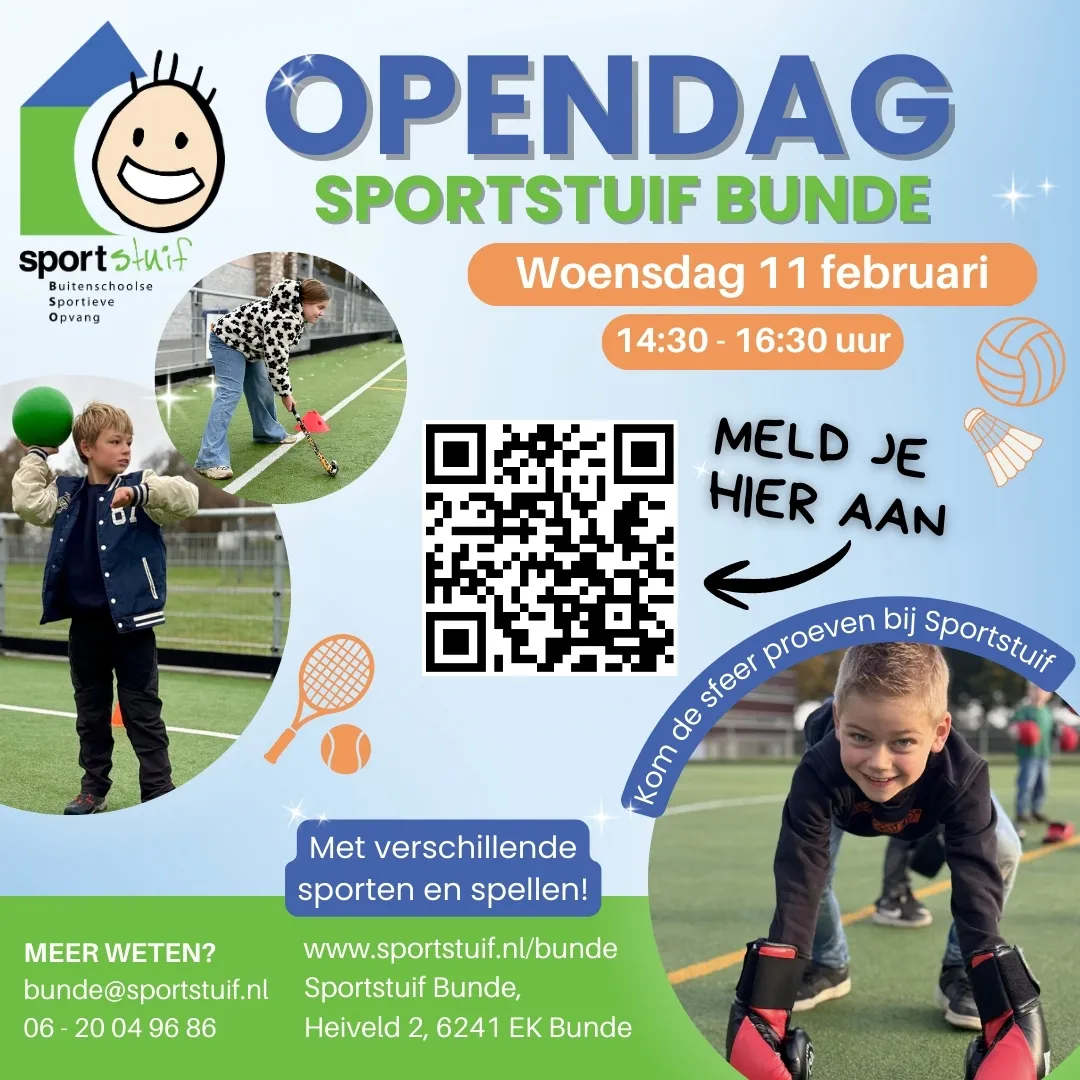 Wil je hierbij zijn? Check dan onze socials of scan de QR-Code hieronder en meld je aan. We kijken ernaar uit om jullie persoonlijk te ontmoeten en Sportstuif Bunde te laten zien.