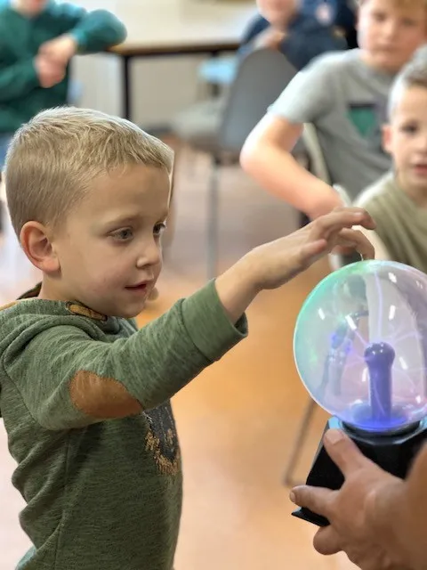 Een van de hoogtepunten was onze science les, die werd gegeven door meester Rodyn! De kinderen ontdekten hoe elektriciteit werkt met behulp van een plasma bol. Met grote ogen zagen ze hoe lichtflitsen meebewogen met hun vingers, alsof ze zelf bliksem konden sturen! Naast het wow-effect leerden ze ook wat statische elektriciteit is en hoe veilig experimenteren leuk én leerzaam kan zijn.
