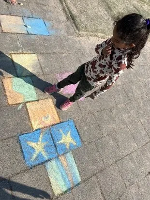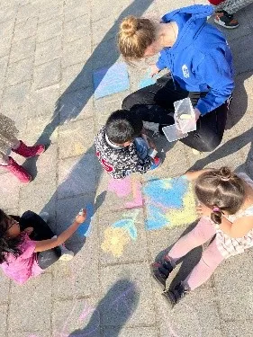 Aan het begin van de maand hebben we veel tijd buiten doorgebracht. Het zachte en zonnige weer nodigde uit om lekker in beweging te zijn en samen te spelen. De kinderen maakten volop gebruik van stoepkrijt, waarmee het plein veranderde in een kleurrijk geheel vol tekeningen, spelletjes en creatieve ideeën. Er ontstonden mooie kunstwerken en er werd gezellig samengewerkt.