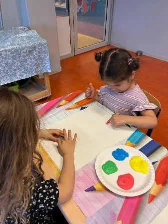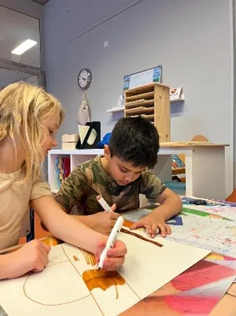 Tot slot hebben we ons creatieve brein aan het werk gezet. De kinderen gingen in tweetallen aan de slag met vingerverven en tekenen. Ze mochten zelf bedenken wat ze wilden maken, wat zorgde voor veel verschillende en originele creaties. Het samenwerken gaf mooie momenten van overleg en inspiratie, en iedereen kon trots zijn op het eindresultaat.