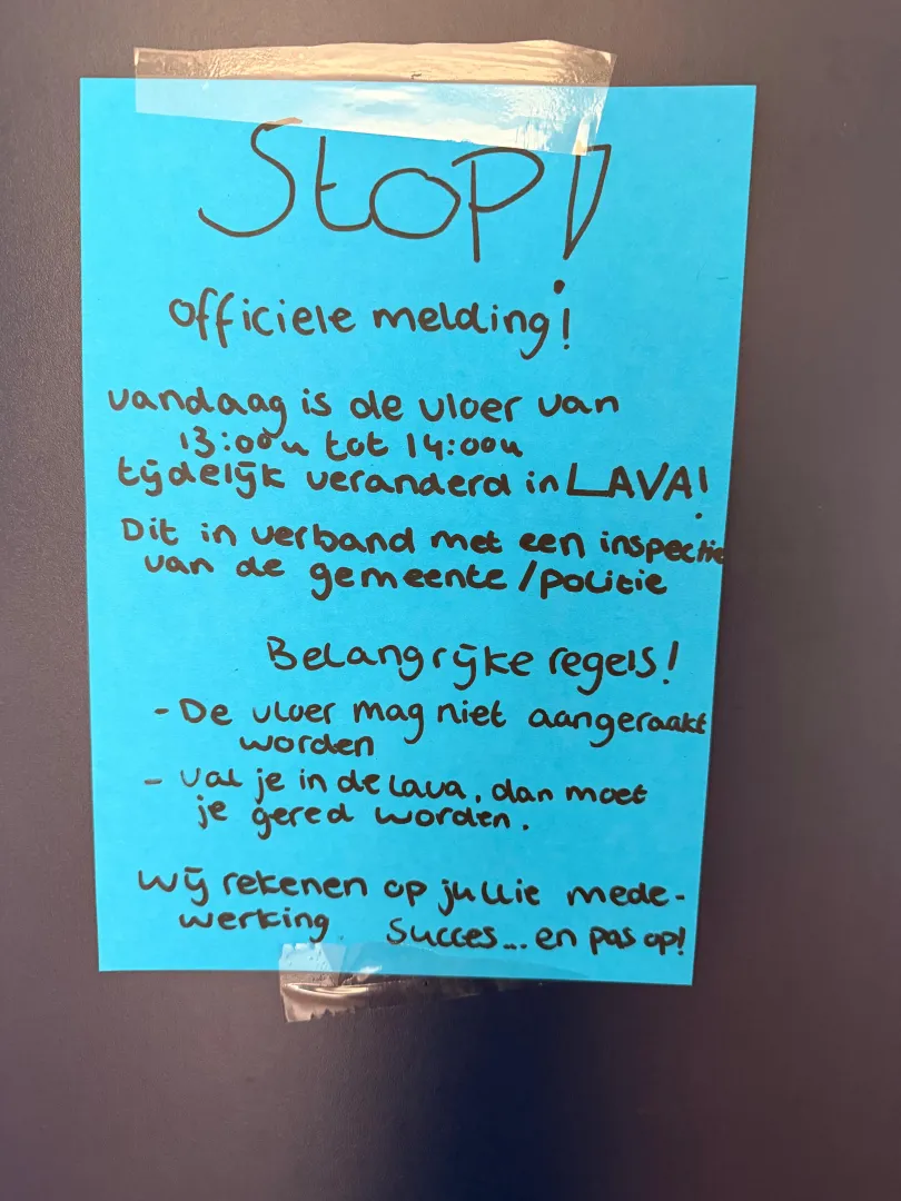 De maand begon op 1 april, en natuurlijk konden wij het niet laten om een grapje uit te halen. Op de BSO hadden Thomas en ik een briefje opgehangen aan de deur met de mededeling dat de politie langs was geweest en dat de vloer een heel uur lava was. De kinderen moesten samenwerken om niet op de grond te staan en over alles te lopen wat er lag, zoals blokken, hoepels, touwen en matten. Ze vonden het geweldig en uiteindelijk hebben ze wel 2 uur lang fanatiek meegedaan. Het was prachtig om te zien hoe creatief en fanatiek ze werden.