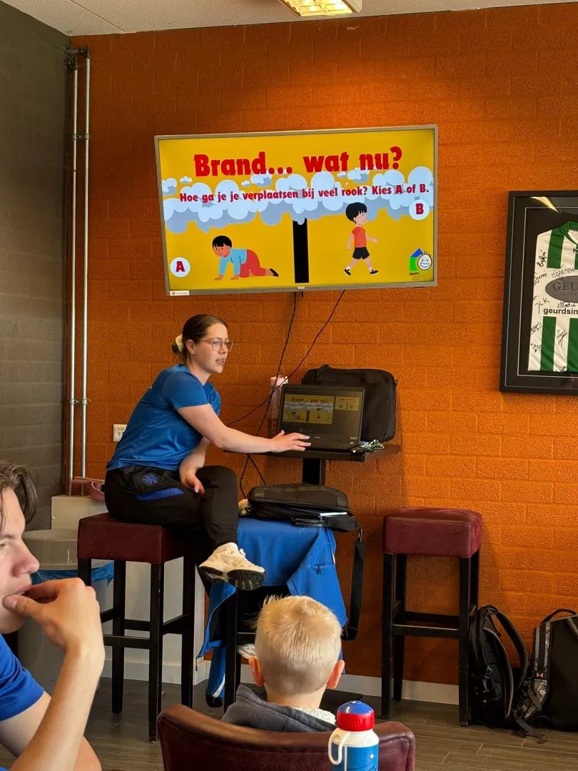 Bij Sportstuif staan niet alleen spel en plezier centraal, maar zeker ook de veiligheid van de kinderen. Daarom hebben we deze week elke dag een brandoefening gedaan, zodat alle kinderen die op de BSO komen dit minimaal één keer hebben gezien én meegedaan. Vooraf kregen de kinderen een korte presentatie, waarin ook een leuke kennisquiz zat verwerkt. Eén van de vragen was bijvoorbeeld: als er veel rook is, kun je dan blijven lopen of moet je juist gaan kruipen? Het juiste antwoord is natuurlijk kruipen, omdat rook zich eerst bovenin verspreidt en later pas naar beneden zakt. Na de uitleg was het tijd om te kijken of de kinderen goed hadden opgelet. Toen het alarm daadwerkelijk afging, wisten de meesten precies wat ze moesten doen en waar ze naartoe moesten. We verzamelden bij de grote goal aan de rechterkant, terwijl de Sportstuif-medewerkers het gebouw controleerden en nagingen of iedereen op de afgesproken plek aanwezig was. De oefening verliep super goed en iedereen heeft ontzettend zijn of haar best gedaan.