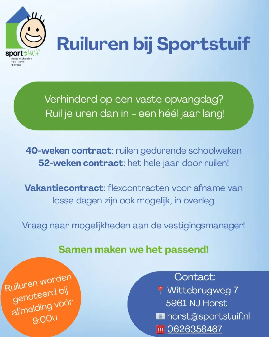 Wist je dat we bij Sportstuif ruil uren hebben! Wanneer je op een vaste dag plots geen opvang meer nodig hebt en dus de uren die dag niet maakt, kan je deze op een andere dag weer inzetten. Hoe handig is dat, zo ben je ze nooit kwijt voor één heel jaar lang!!
