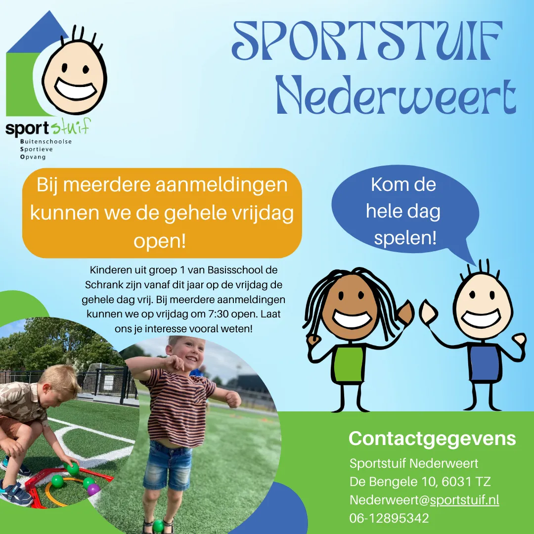 Sinds dit schooljaar is er iets nieuws voor de kinderen van groep 1 van basisschool De Schrank: zij zijn voortaan de hele vrijdag vrij! En dat betekent… nóg meer tijd voor plezier bij Sportstuif!