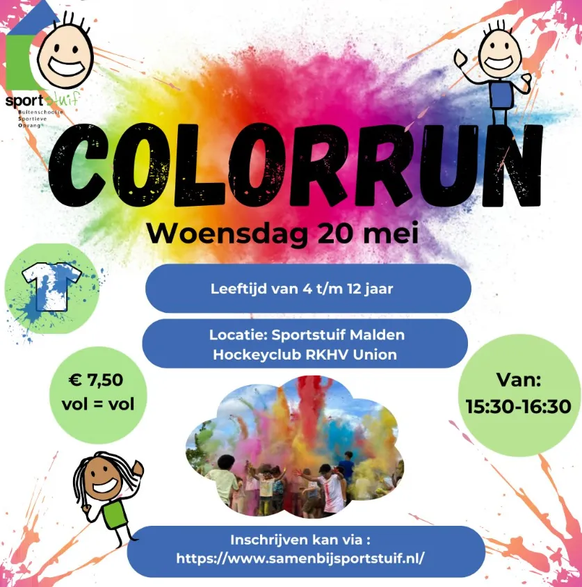 Tijdens deze feestelijke run worden de kinderen onderweg verrast met kleurrijk poeder en trotseren ze de leukste klim- en klauterobstakels. Een middag vol sport, plezier en kleur dus! 🏃