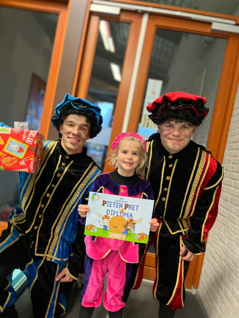 De kinderen deden allerlei leuke spellen waarbij ze vooral veel met cadeautjes bezig waren. Ze zagen er net uit als echte pietjes! Later kwamen er zelfs twee pieten langs om te kijken hoe het ging. Na veel klimmen en klauteren kregen alle kinderen een mooi pietendiploma. Toen ze weer naar buiten gingen, kregen ze ook nog wat lekkere pepernoten van de pieten.