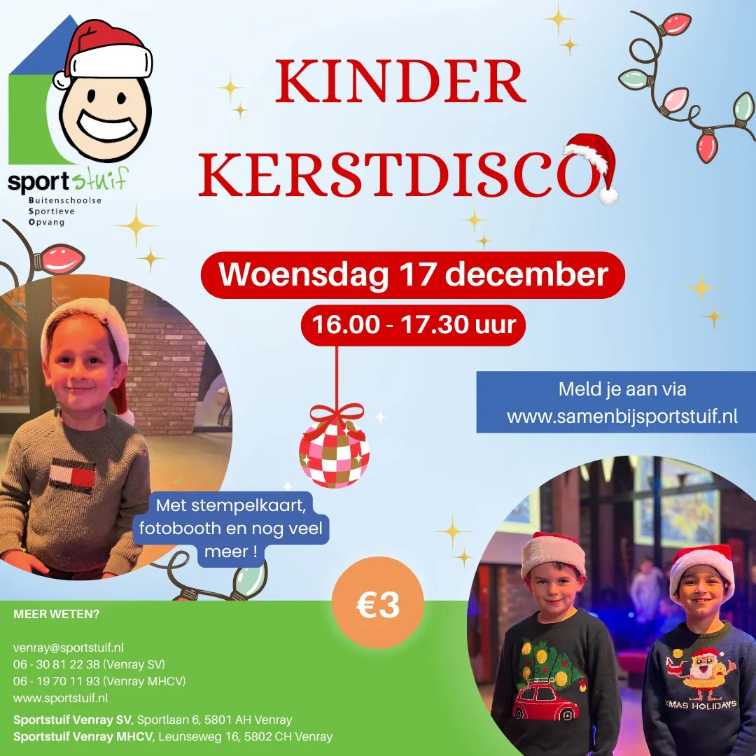 Op woensdagmiddag 17 december van 16:00 tot 17:30 uur, organiseert Sportstuif Venray een te gekke kinder kerstdisco voor alle basisschoolkinderen uit Venray en omgeving!